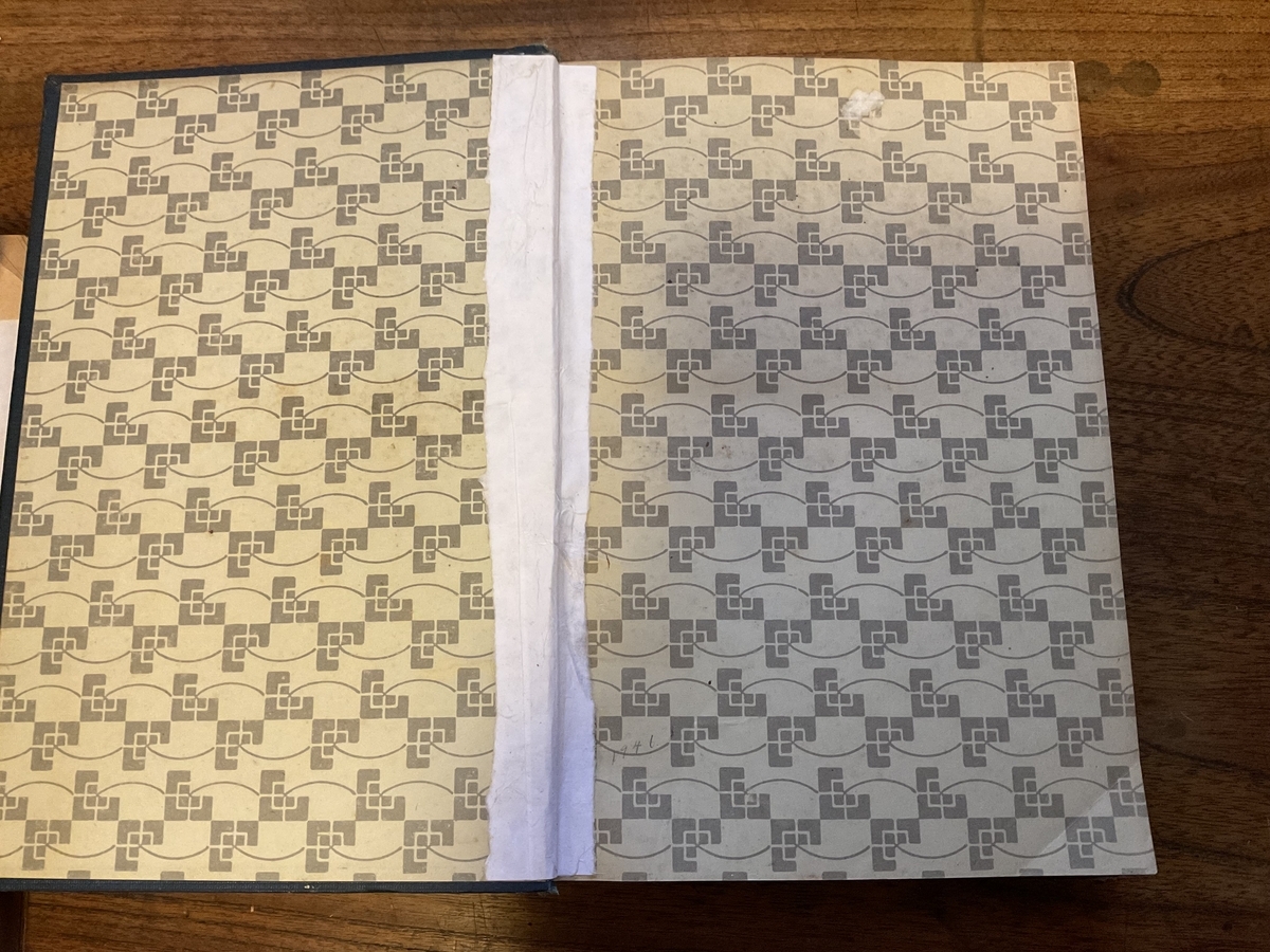 上画像ようにノドが破れトレカ買っています、失礼、取れかかっています。幸い中の白いアミアミ(寒冷紗)や支持帯は無事でありましたので、見返しのノドの補強だけですませます。