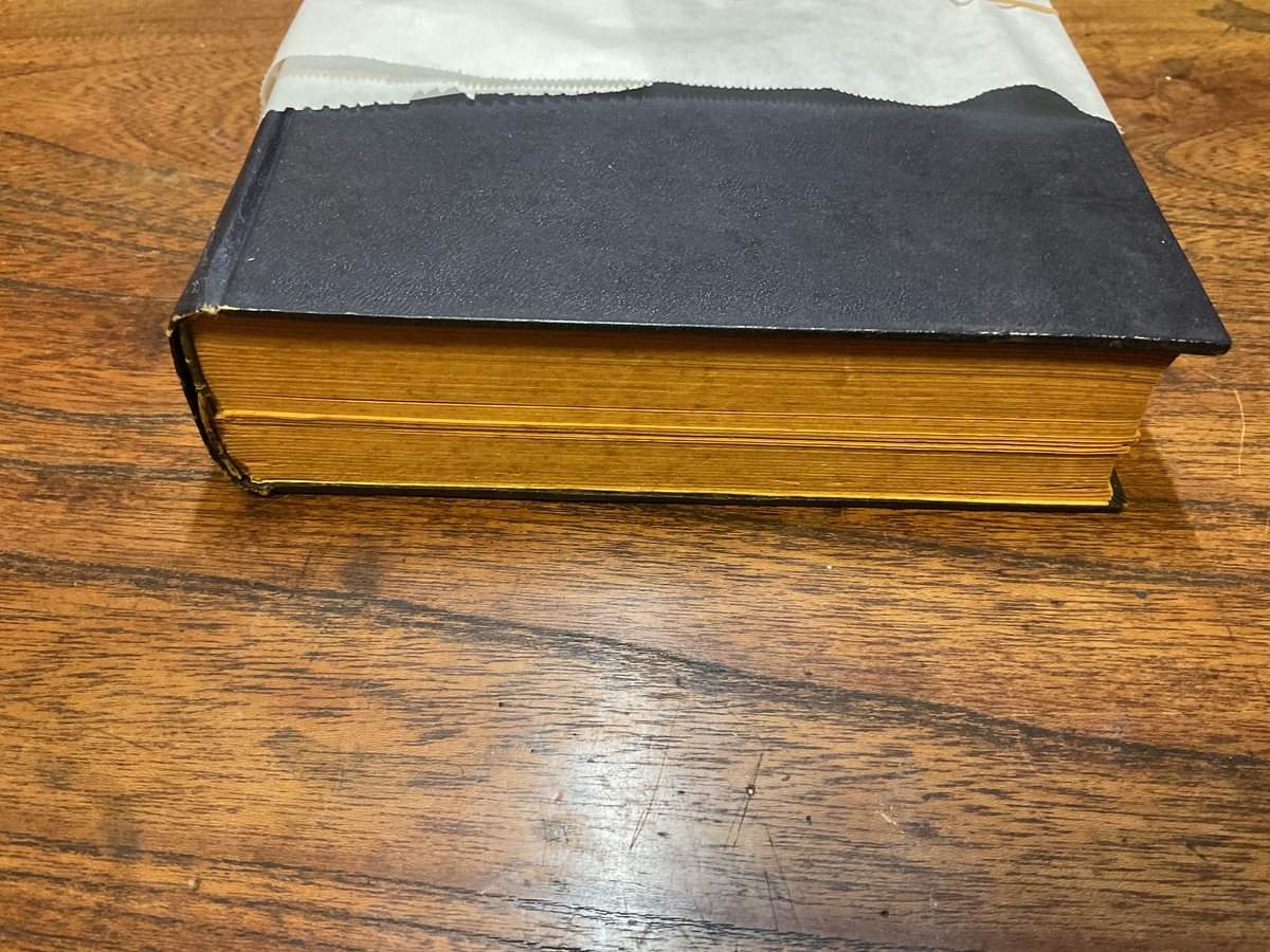 さて、今回修理しますのは、目次にありましたとおり、①②本と表紙の間の「ノド」と呼ばれる部分、③外れたページの修復、④やぶれた背芯紙の修復、そして⑤ステープラー(ホッチキス)で留められた本の、保全のための綴じ作業(断念)になります。